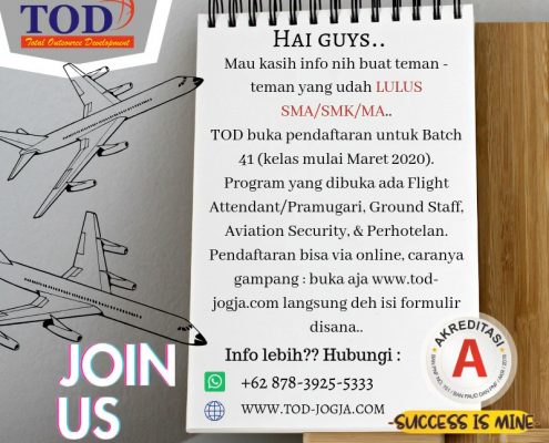 TOD Jogja merupakan lembaga pendidikan & pelatihan dengan akreditasi A oleh Dinas Pendidikan. Memiliki Program Jurusan unggulan seperti Pramugari, Staf Penerbangan/Ground Staff & Avsec (Aviation Security). TOD Jogja memiliki metode pelatihan singkat, profesional dengan biaya pendidikan terjangkau. Tempat pendidikan yang nyaman didukung dengan pengajar yang profesional & ramah adalah kunci keberhasilan dalam menyiapkan SDM dunia penerbangan yang siap bersaing di dunia kerja.