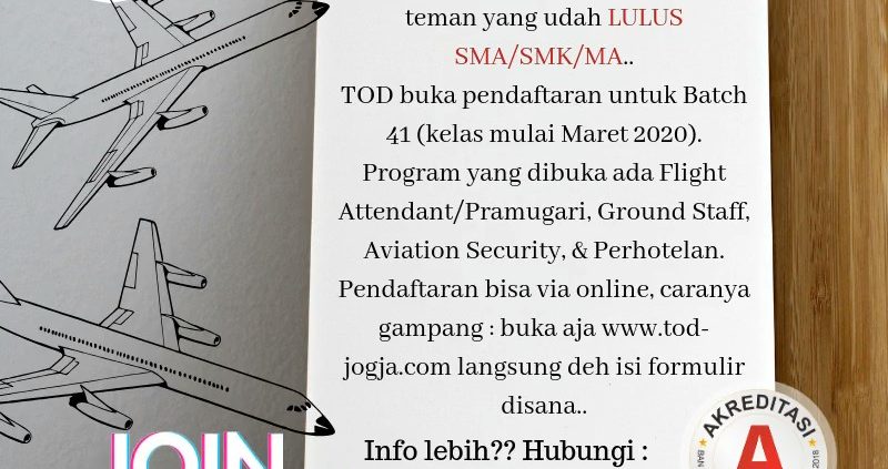 Hai hai semua.. Kali ini TOD Jogja mau kasih info nih buat kalian yang sudah LULUS SMA/SMK/MA. Apa kak? Yaps, sekarang TOD membuka pendaftaran untuk Batch 41 (kelas dimulai Maret 2020). Program yang dibuka adalah Flight Attendant/ Pramugari, Ground Staff, Aviation Security, dan Perhotelan. So buat kalian yang mau daftar langsung aja klik link www.tod-jogja.com. […]