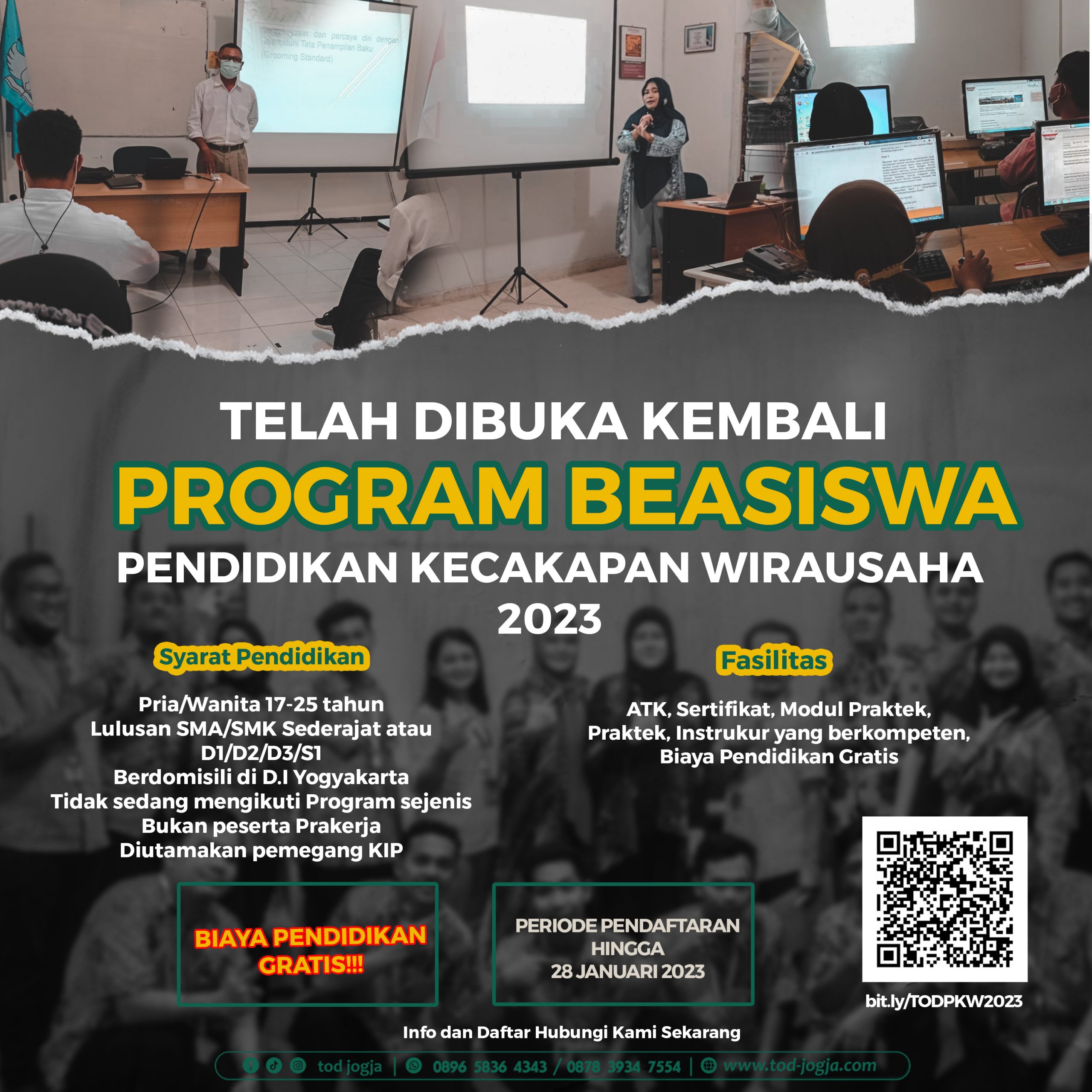 Harapannya program ini dapat membantu masyarakat khususnya yang berdomisili KTP DIY, untuk mendapatkan ilmu dan skill agar dapat berwirausaha. Manfaatkan program pendidikan GRATIS ini, baca persyaratannya & hubungi kami jika ada pertanyaan.